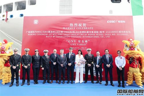 10月23日,由中国船舶集团所属广船国际为全球领先的运输与物流企业地中海航运集团旗下客渡轮运营商Grandi Navi Veloci(GNV)量身打造的一艘现代化大型绿色豪华双燃料客滚船——MSC/GNV1800客/2800米车道豪华客滚船“GNV·VIRGO(GNV·室女座)”号在广州南沙命名交付。